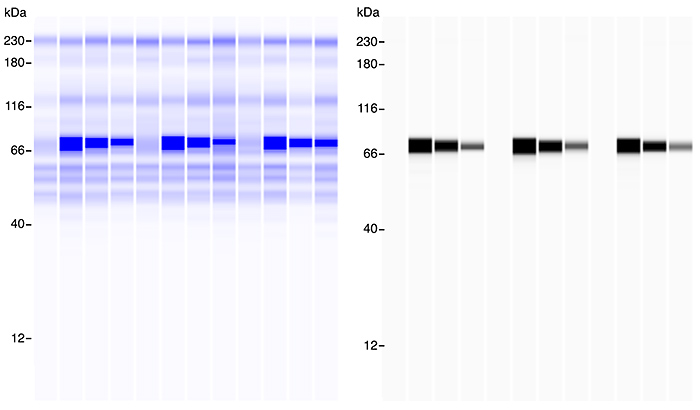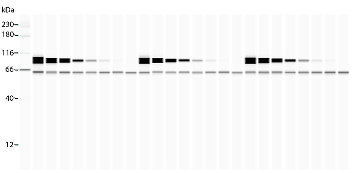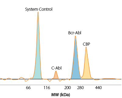 図 3. シンプルウェスタンの90kDaのシステムコントロール(内部標準)と、K562細胞中の内因性C-Abl、BCR-ABL、およびCBPがウェスによって同時に検出されます。